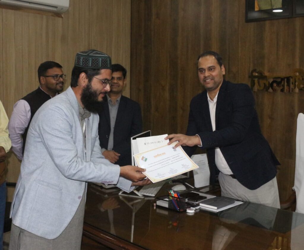 मुरादाबाद। भारत निर्वाचन आयोग के निर्देशानुसार जिले में चलाए जा रहे विशेष प्रगाढ़ पुनरीक्षण कार्य में उत्कृष्ट प्रदर्शन करने वाले 24 बीएलओ को जिलाधिकारी/ जिला निर्वाचन अधिकारी अनुज सिंह ने कलेक्ट्रेट कार्यालय में सम्मानित किया।जिलाधिकारी द्वारा सम्मान प्राप्त करने वाले बीएलओ में तहसील सदर के पवन शर्मा, विवेक कुमार, पूनम वर्मा, रश्मि सिंह, तहसील कांठ के मो. परवेज, गायत्री देवी, सीमा रानी, कपिल कुमार, तहसील बिलारी के आनंद कुमार, निशांत सिंह, गीता, भगत सिंह, जगवीर सिंह, कावेरी शर्मा, सुनीता रानी, साधना सागर, भूरे सिंह, जूबी, मो. जुम्मा खान, तहसील ठाकुरद्वारा के प्रेमपाल सिंह, संजय कुमार, हेमवीर सिंह, पूजा रानी और शहनाज जहां शामिल हैं।