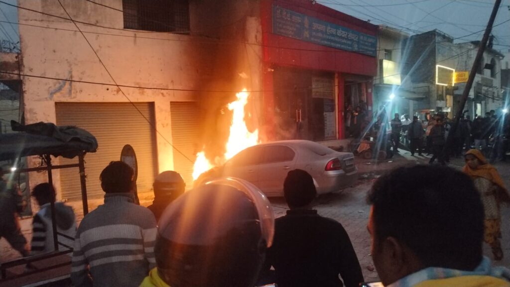 मुरादाबाद। कटघर थाना क्षेत्र के गोविंद नगर इलाके में रविवार शाम उस वक्त अफरा-तफरी मच गई, जब सड़क किनारे खड़ी एक कार पर अचानक 11 हजार वोल्ट की हाईटेंशन लाइन टूटकर गिर गई। तेज चिंगारी के साथ कार में आग लग गई और देखते ही देखते वाहन धू-धू कर जलने लगा।
