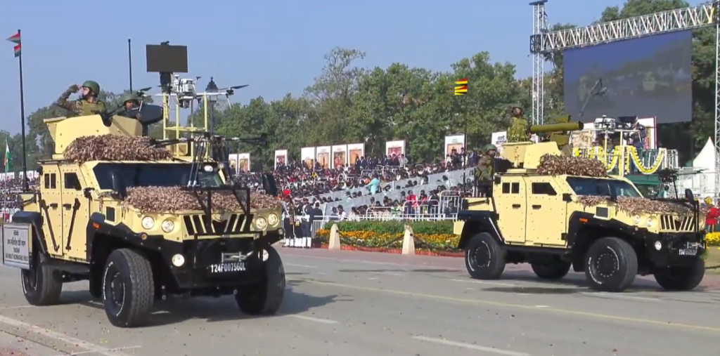 कर्तव्य पथ पर भारत का पहला स्वदेशी रूप से डिजाइन किया गया आर्मर्ड लाइट स्पेशलिस्ट व्हीकल, हाई मोबिलिटी रिकॉनैसेंस व्हीकल (HMRV) प्रदर्शित किया गया. इसे महिंद्रा डिफेंस सिस्टम्स ने विकसित किया है और वर्ष 2023 में इसे सेना में शामिल किया गया था. यह वाहन अत्याधुनिक बैटलफील्ड सर्विलांस रडार से लैस है, जो जवानों, वाहनों और कम ऊंचाई पर उड़ने वाले हेलिकॉप्टरों का पता लगाने में सक्षम है. इसके साथ ड्रोन, उन्नत संचार प्रणाली और एंटी-ड्रोन गन भी लगी हैं, जिससे यह छोटे दस्तों को दुश्मन की गश्ती टुकड़ियों और यहां तक कि बख्तरबंद लक्ष्यों को भी नष्ट करने में सक्षम बनाता है. भारतीय नौसेना का मार्चिंग कंटिन्जेंट भी कर्तव्य पथ पर परेड में हिस्सा लेता नजर आया.