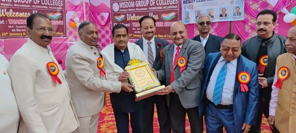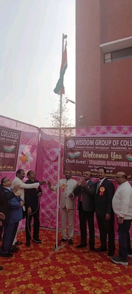 मुरादाबाद। देश के 77वें गणतंत्र दिवस के पावन अवसर पर विजडम ग्रुप ऑफ कॉलेज, मुरादाबाद परिसर में भव्य और गरिमामय समारोह का आयोजन किया गया। कार्यक्रम में मुख्य अतिथि के रूप में उपस्थित कुंदरकी विधायक ठाकुर रामवीर सिंह ने पूरे सम्मान और राष्ट्रीय गौरव के साथ ध्वजारोहण किया। जैसे ही तिरंगा फहराया गया, परिसर भारत माता की जय और वंदे मातरम् के उद्घोष से गूंज उठा।