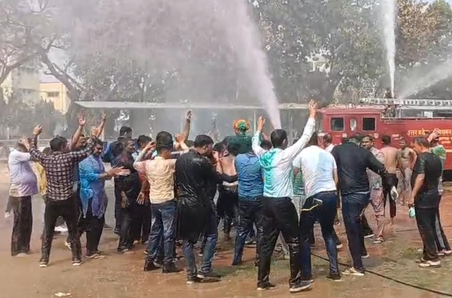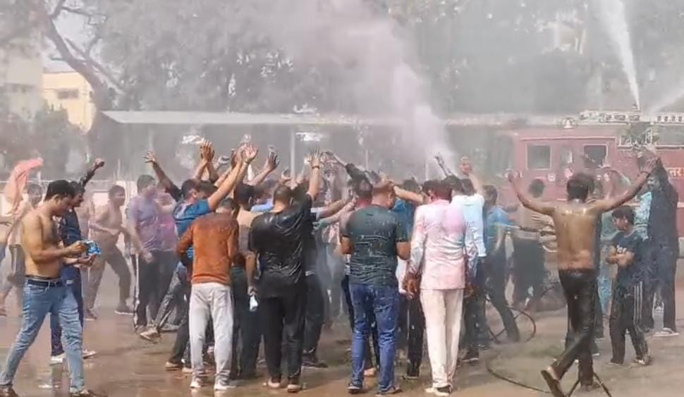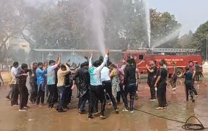 कार्यक्रम के दौरान फायर ब्रिगेड की गाड़ी से पानी की बौछारें भी की गईं। पानी की तेज फुहारों के बीच जवानों और अधिकारियों ने जमकर होली खेली और एक-दूसरे को रंगों से सराबोर कर दिया। इस अनोखे अंदाज में मनाई गई होली ने पूरे माहौल को और भी उत्साहपूर्ण बना दिया।