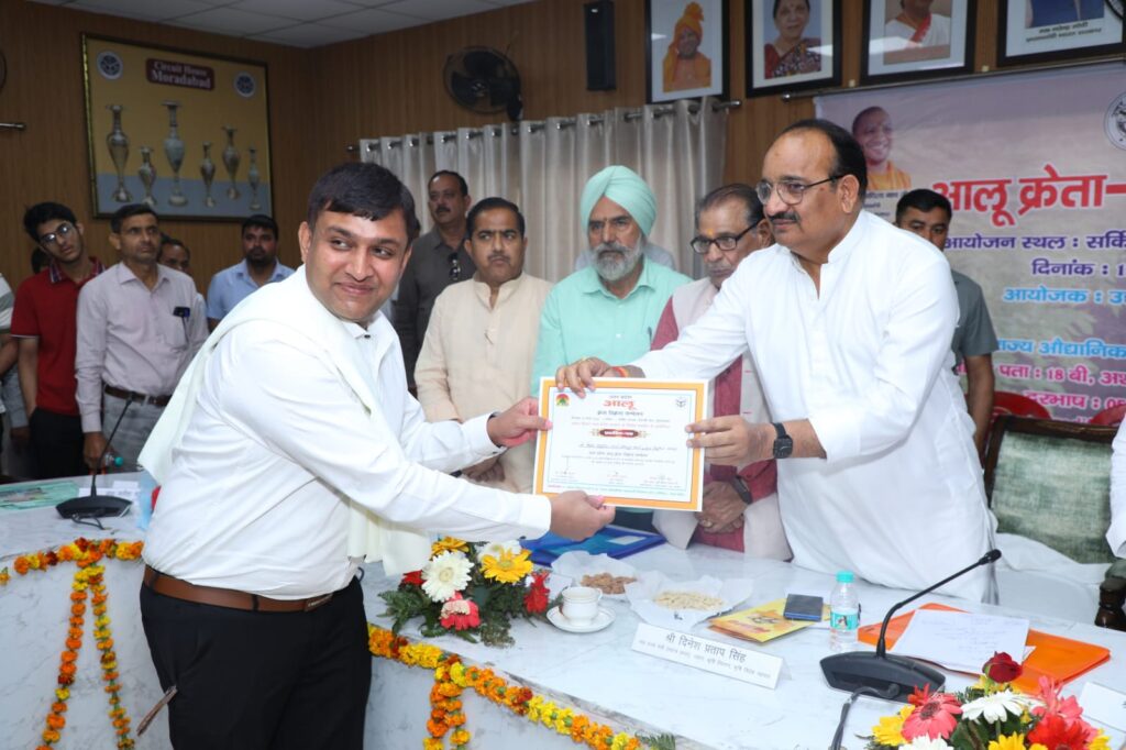 मुरादाबाद। आलू के विपणन और निर्यात को बढ़ावा देने के उद्देश्य से उद्यान विभाग उत्तर प्रदेश तथा उत्तर प्रदेश राज्य औद्यानिक सहकारी विपणन संघ (हाफेड) द्वारा शुक्रवार को सर्किट हाउस मुरादाबाद में एक दिवसीय आलू क्रेता-विक्रेता सम्मेलन आयोजित किया गया। कार्यक्रम में प्रदेश के उद्यान, कृषि विपणन, कृषि विदेश व्यापार एवं कृषि निर्यात विभाग के राज्य मंत्री (स्वतंत्र प्रभार) दिनेश प्रताप सिंह मुख्य अतिथि के रूप में शामिल हुए।